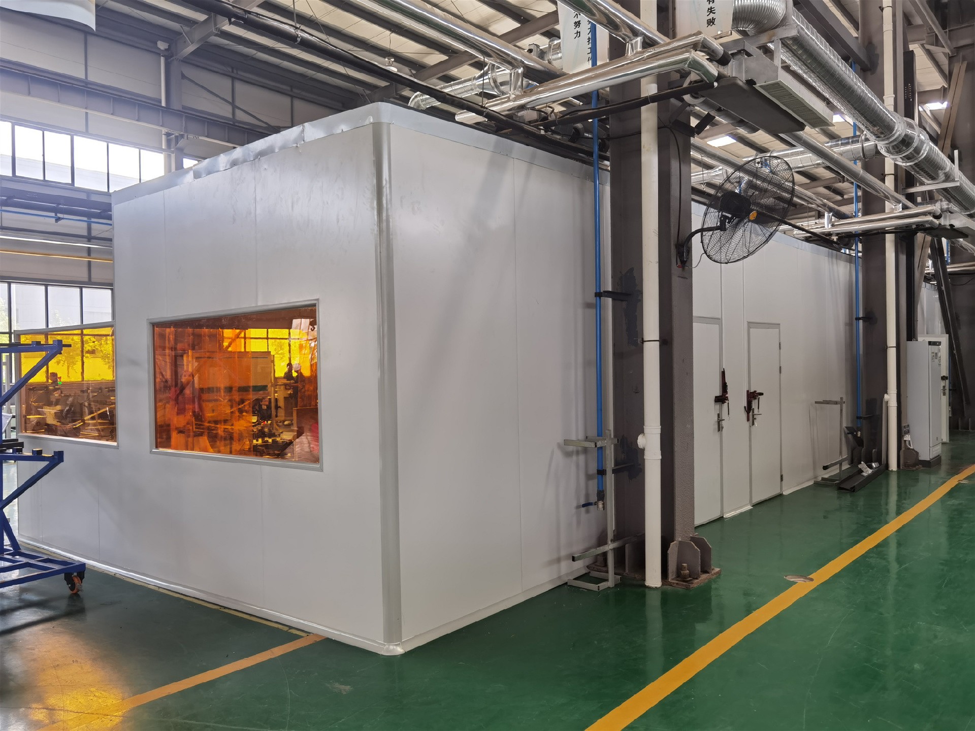 科技美藍,智慧除塵,大家好,今天給大家分享大型工件打磨拋光產(chǎn)生的粉塵怎樣處理?這是我們?yōu)槟衬茉囱b備生產(chǎn)企業(yè)鈦合金打磨車(chē)間設計制作的防爆無(wú)塵打磨除塵系統,客戶(hù)現場(chǎng)打磨工件比較大,需要行車(chē)吊裝工件,且打磨時(shí)粉塵量比較大,了解具體工況及跟客戶(hù)溝通后,采用美藍環(huán)保4臺防爆款打磨除塵柜+打磨房的處理方式,打磨房尺寸10m(長(cháng))*10m(寬)*6m(高),鋼結構整體框架,防腐蝕龍骨搭建,板材選用碳鋼噴塑鈑金材質(zhì),在房頂兩側加裝送風(fēng)管道,凈化后的空氣通過(guò)管道進(jìn)入射流口吹到房間里,實(shí)現空氣內循環(huán)。并在房頂加裝一個(gè)可伸縮的電動(dòng)天幕,吊裝工件的時(shí)候收縮,作業(yè)的時(shí)候可打開(kāi)覆蓋房間。為達到良好的送風(fēng)效果,在門(mén)口兩側各加裝風(fēng)幕,形成一個(gè)無(wú)形的門(mén)簾,防止粉塵不外溢。