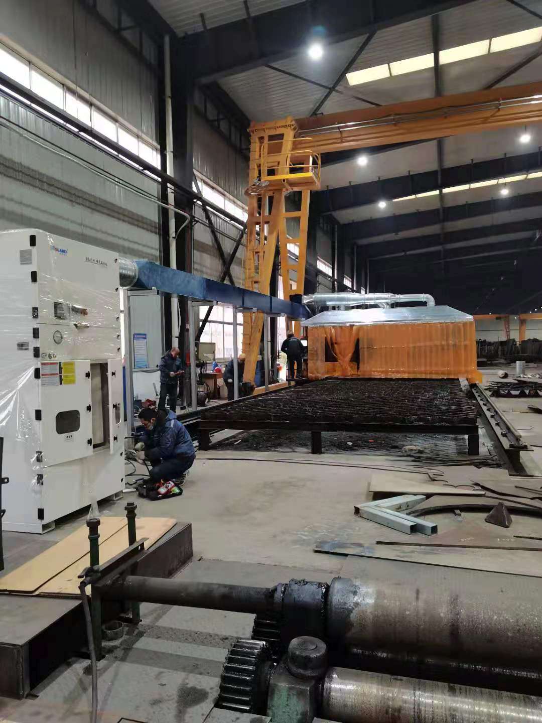 在切割平臺的一側放置一根滑動(dòng)吸風(fēng)道,其上面有一個(gè)可隨切割機一起移動(dòng)的吸風(fēng)口。吹風(fēng)口固定在切割機上,且與切割頭保持在一條線(xiàn)上。切割平臺下部是帶有立板的格柵,與切割的板材形成密封的風(fēng)道,始終保持只在切割的有限寬度內即產(chǎn)生煙塵的部位抽風(fēng)。工作時(shí),密封皮帶在管道負壓的作用下,緊緊地貼附在方形吸風(fēng)道上方,起到密封的作用。在滑動(dòng)吸風(fēng)小車(chē)處,滑動(dòng)吸風(fēng)小車(chē)內有兩個(gè)滾軸;密封皮帶在此處被頂起,這樣煙塵通過(guò)滑動(dòng)吸風(fēng)小車(chē)吸風(fēng)口進(jìn)入方形吸風(fēng)道,最后吸入濾筒凈化器主機過(guò)濾凈化。